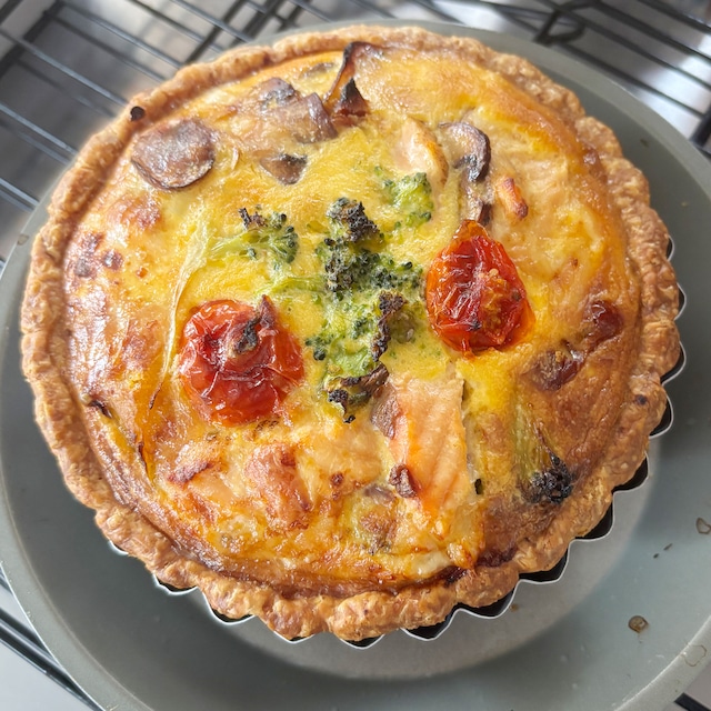 15cmホール(約4人分) 素材にこだわった季節の野菜を使ったキッシュ。サーモンまたはベーコンをお選びいただけます。自家製のパイ生地にブロッコリー、パプリカ、フレッシュなハーブ、たっぷりのナチュラルチーズが絶妙に組み合わさった一品です。香ばしく焼き上げたキッシュが、食卓を華やかに彩ります。 サイズ:直径15cm 高さ5cm(約4人分) 重量:430g 保存方法:要冷蔵10℃以下で保存 消費期限:製造日より1週間 # サーモンと旬野菜のキッシュ #ベーコンと旬野菜のキッシュ