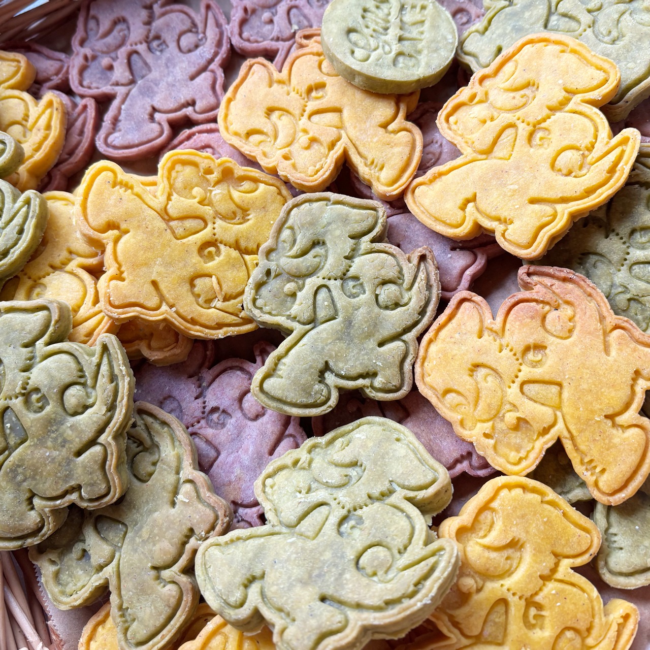 愛犬が喜ぶハードクッキーです。かぼちゃ、紅芋、ブロッコリーの赤・黄・緑の見た目も楽しい3色。カルシウムたっぷりの煮干し粉とミルクを加え硬めに焼き上げました。